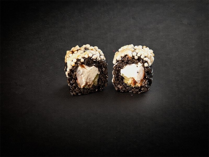 Рис, нори, черный краситель, креметта, огурец, креветки, угорь, ореховый соус, соус унаги, рисовые шарики ( 8 шт )