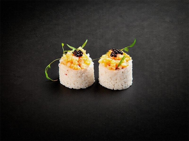 Рис, нори, кремктта, огурец, авокадо, креветка, соус том ям, икра черная имитация ( 8 шт )
