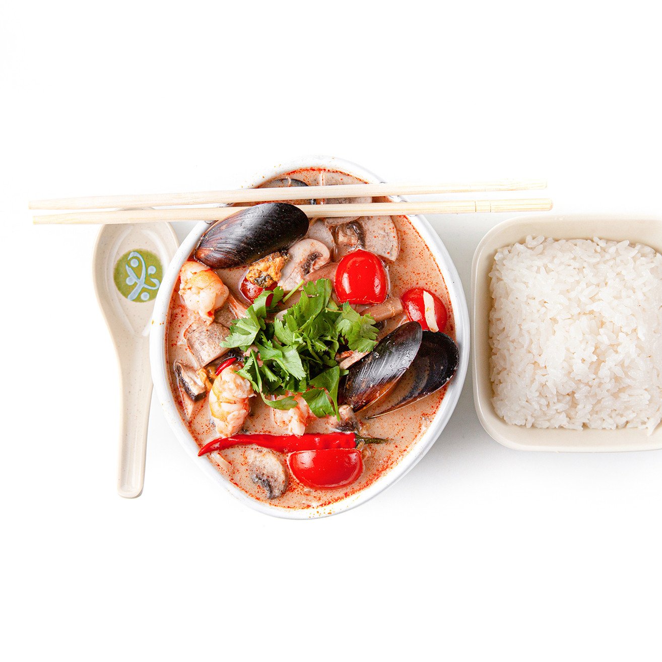 Пряный и ароматный тайский суп с морским акцентом. Насыщенный кокосовый бульон наполнен кальмарами, креветками и ароматными грибами. Острый чили, красный лук и рис придают глубину и насыщенность, а свежая кинза и томаты черри украшают блюдо яркими красками. Настоящая экзотика в каждой ложке!